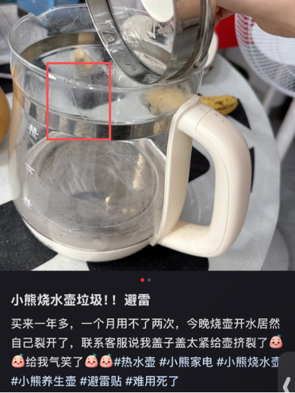 近期,在小红书、消费保及黑猫投诉等平台,涉及小熊电器多款壶类产品玻璃部件无故开裂或爆裂的投诉增多。多位消费者反映,问题均发生于正常加热过程,而非外力磕碰。